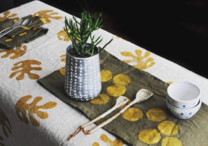 Beemo Textiles Beemo Textiles from Brie Moblo features colorful shapes that have been block-printed by hand to bring a pop of color and handmade beauty